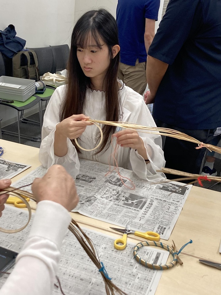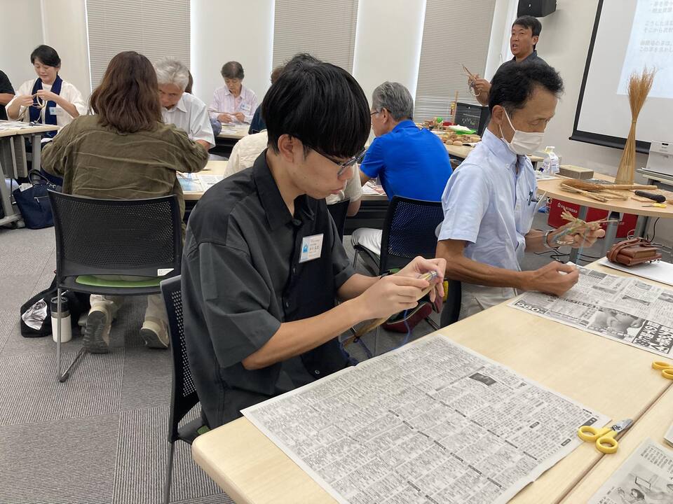 また、ワークショップでは受講者さんが先生の指導のもと、ミニ茅の輪づくり体験などもあり、器用にさっさと作り上げる人、悪戦苦闘する人、色々でしたが、グループで助け合いながら、萱の輪を作り上げていました。