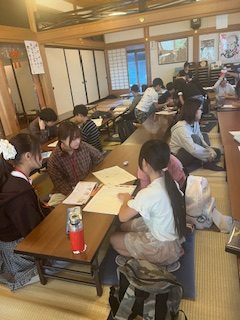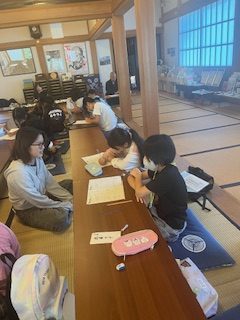 そして、10月18日(土)にも龍津寺の土曜こども寺子屋に参加し、小島地区の子どもたちと交流を行った。今回は、小学6年生が修学旅行ということで、いつもと比べて寺子屋に参加する子どもの数が少なかった。勝野住職による日本国憲法第14条と論語の解説の後、各自の勉強の時間となったが、持参した課題が少なかったせいか、いつもより早い時間に勉強を切り上げ、遊び始める子どもたちもいた。勉強の後は、お茶とお菓子の時間となり、学生たちは各自子どもたちと話しをしながら交流を図っていた。