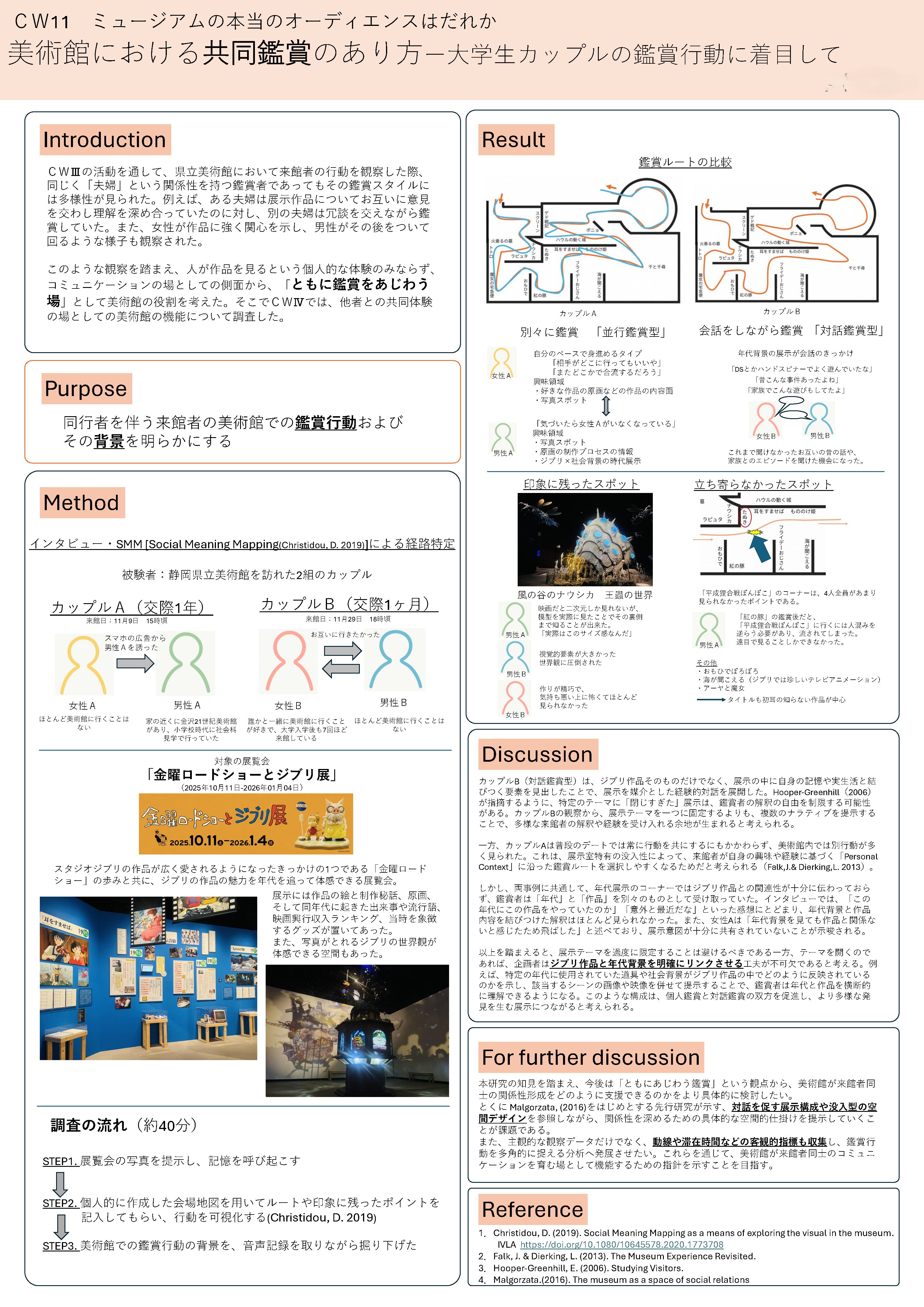 2025年度 CWポスター発表会 ミュージアムの本当のオーディエンスはだれか(ワーク11) 2026/01/06 2025年12月18日(木)大学会館ホールにて、2025年度CWポスター発表会を実施しました。発表会では以下のポスターが掲示されました。 【1枚目】 【2枚目】