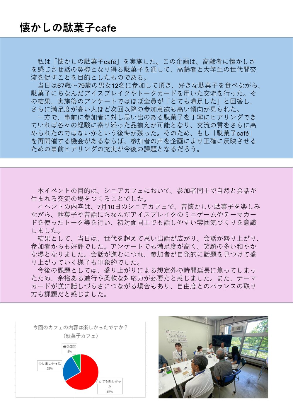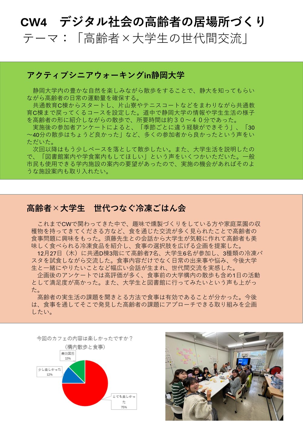 2025年度 CWポスター発表会 デジタル社会の高齢者の居場所づくり(ワーク1) 2026/01/05 2025年12月18日(木)大学会館ホールにて、2025年度CWポスター発表会を実施しました。発表会では以下のポスターが掲示されました。 【1枚目】 【2枚目】 【3枚目】 【4枚目】 【5枚目】