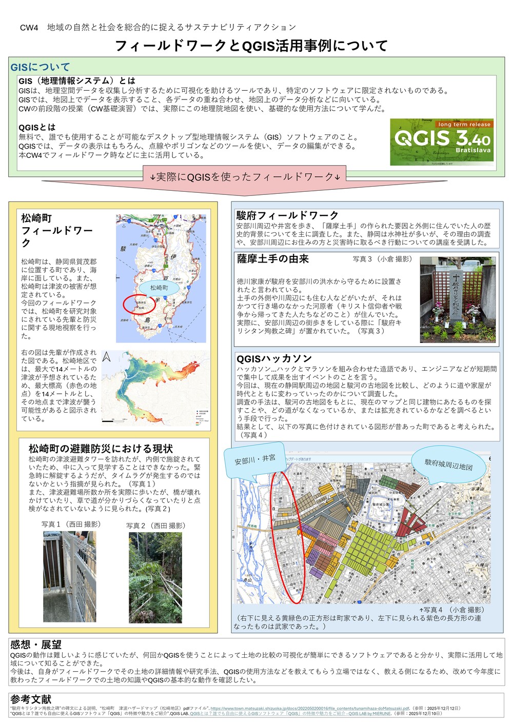 2025年度 CWポスター発表会 地域の自然と社会を総合的にとらえるサスティナビリティーアクション(ワーク4) 2026/01/05 2025年12月18日(木)大学会館ホールにて、2025年度CWポスター発表会を実施しました。発表会では以下のポスターが掲示されました。 【1枚目】 【2枚目】 【3枚目】