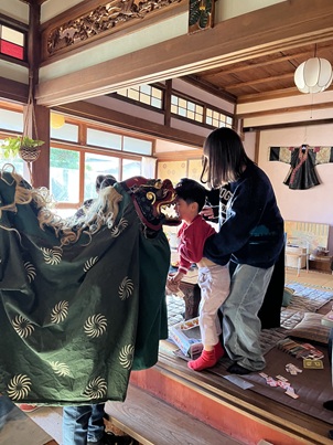 獅子舞が、なんと!まるのばにも来てくれました。ちなみに、まるのばに来てくれた獅子は、学生が中に入っており、まるのばの商売繁盛?を祈願してくれました。ちょうど遊びに来ていた子供たちは最初は怖がっていましたが、慣れてくると健康を願って頭を獅子に噛んでもらうことができました。