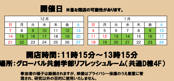 ● 場所:グローバル共創科学学部リフレッシュルーム(共通D棟4F)