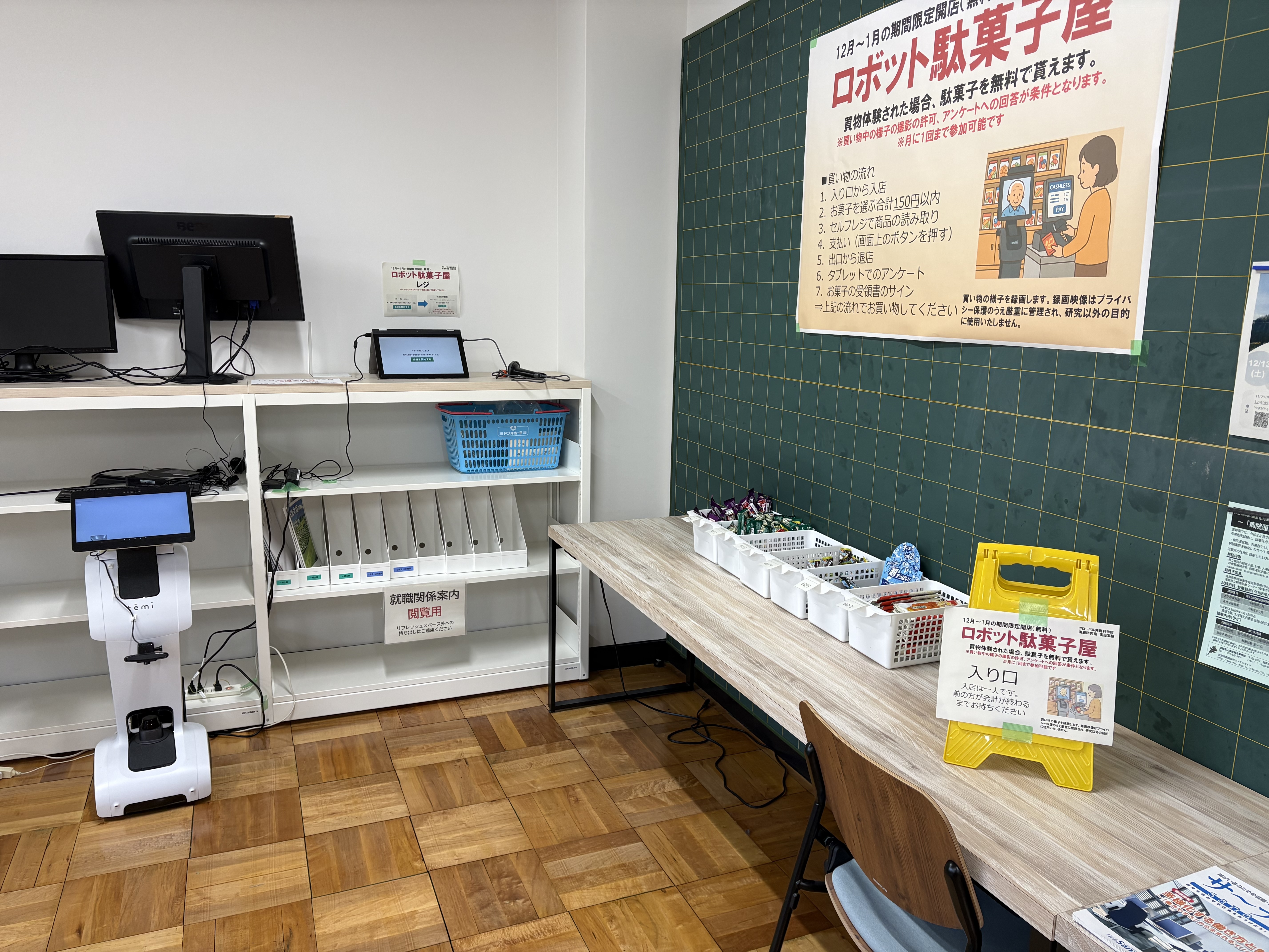 今回、学部内リフレッシュスペースにおいて、地域のシニアの方々が遠隔操作ロボットを用いて接客業務を行う疑似店舗を開設し、高齢者によるリモート就労環境の実証実験を開始します。