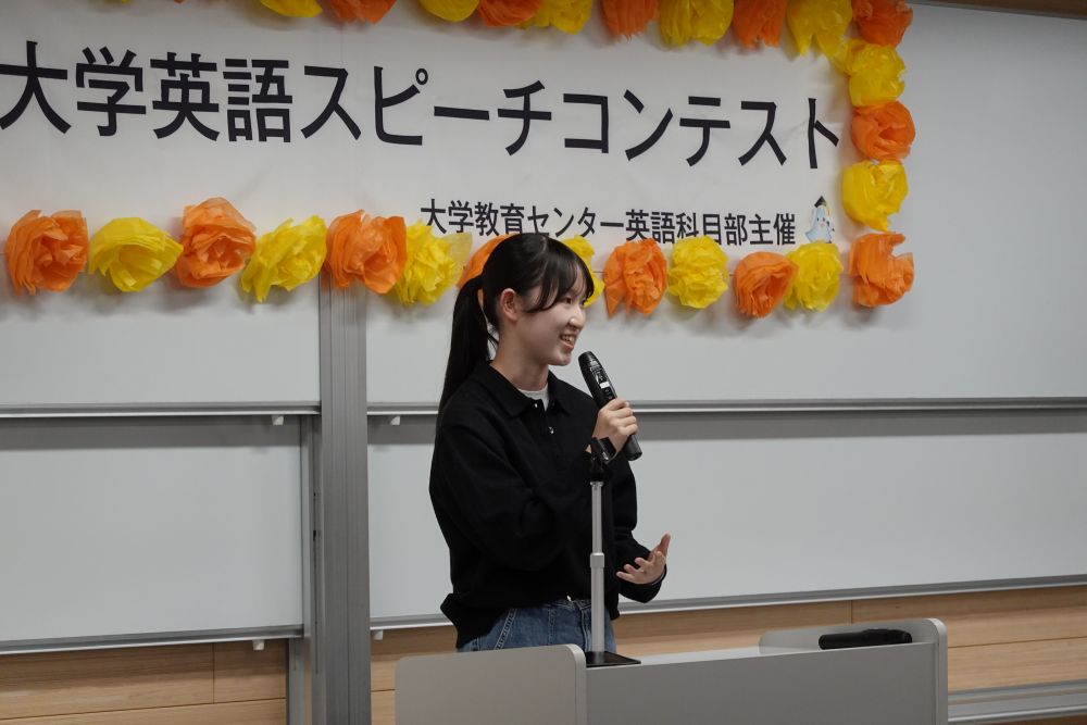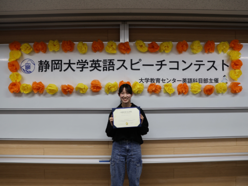 グローバル共創科学部1年生の北澤瞳月さんが、2025年12月18日に開催された第2回静岡大学英語スピーチコンテストにおいて「One Buddy Can Change a Community」というタイトルで発表を行い、審査員特別賞を受賞しました。発表では、北澤さん自身の留学中の経験をもとに、上級生がBuddy(相棒)として新入生をサポートするプログラムの導入を提案してくれました。北澤さん、おめでとうございます!
